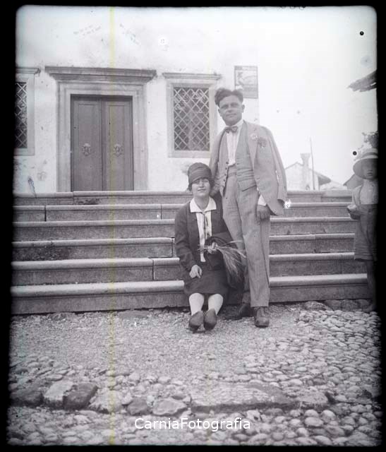 Ritratto in esterno di Pietro Pascoli con la fidanzata Margherita Deotto. La coppia posa presso una scalinata antistante l'ingresso di una chiesa; Margherita Deotto stringe con la mano sinistra un mazzolino di spighe di grano. A destra si scorge il profilo di un bambino. Pietro Pascoli, originario di Quinis di Enemonzo, e Margherita Deotto, originaria di Verzegnis, sono i genitori di Maria Caterina Pascoli, proprietaria della fotografia.