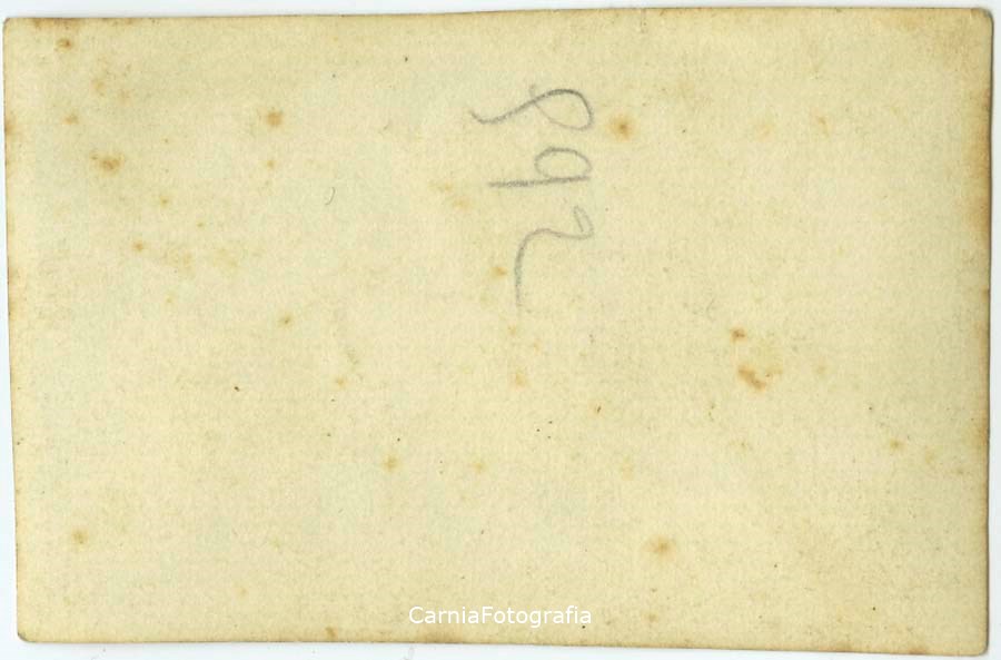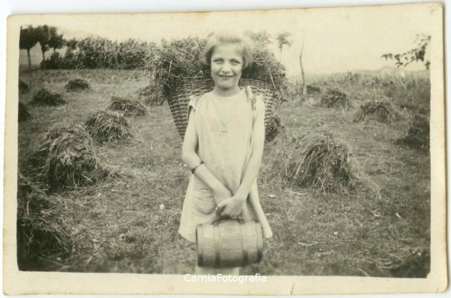 Giovanna Pascoli posa con la gerla sulle spalle durante la fienagione; tra le mani ha una borraccia di legno. Giovanna Pascoli è sorella di Angelina Giacomina Maria Pascoli (1898-1974), madre di Maria Pia Valle (1936), proprietaria della fotografia.