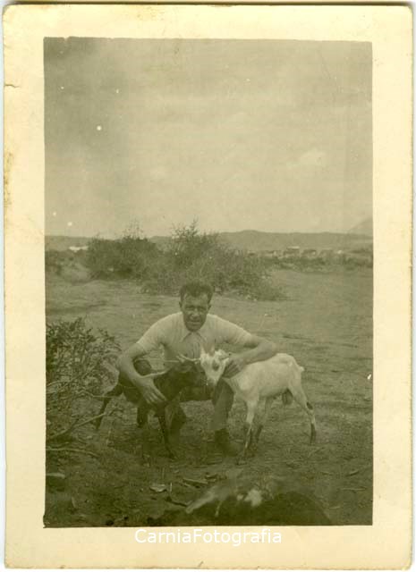 Ottavio Valle posa con due capre nei pressi di Addis Abeba; egli trascorse alcuni anni in Etiopia dove era emigrato con la speranza di fare fortuna con un allevamento di capre. Ottavio Valle è padre di Maria Pia Valle (1936), proprietaria della fotografia.