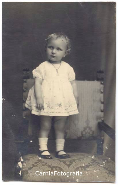 Ritratto in studio a figura intera di Lisi Pascoli. La bambina posa in piedi su una sedia. Lisi Pasoli è la sorella di Maria Caterina Pascoli, proprietaria della fotografia.
