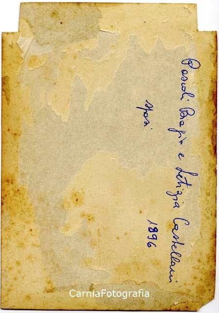 Ritratto in studio di Biagio Pascoli con la moglie Letizia Castellani; il ritratto è stato eseguito in occasione del matrimonio. Biagio Pascoli e Letizia Castellani sono i nonni materni di Maria Pia Valle (1936), proprietaria della fotografia.
