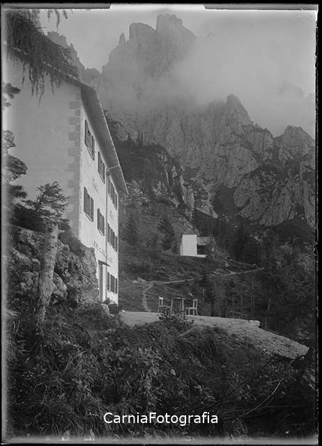 Una veduta dell'esterno del rifugio De Gasperi; sullo sfondo si riconosce la cappella di Maria Ausiliatrice costruita nelle immediate vicinanze