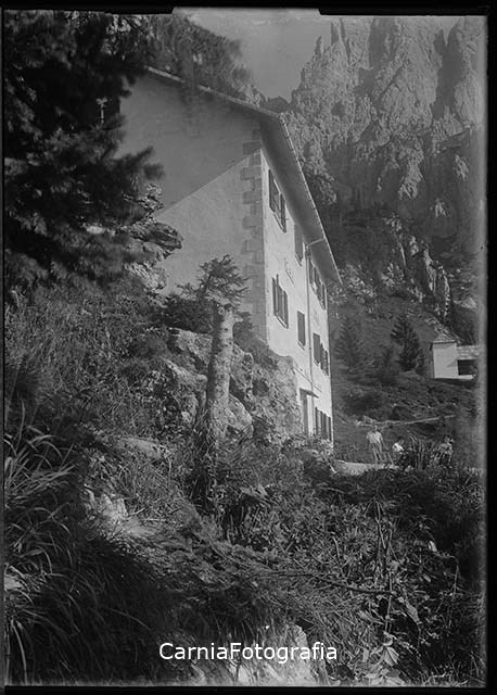 Una veduta dell'esterno del rifugio De Gasperi; sullo sfondo si riconosce la cappella di Maria Ausiliatrice costruita nelle immediate vicinanze