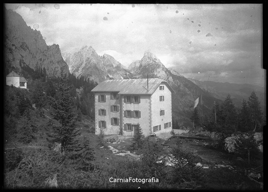 Una veduta dell'esterno del rifugio De Gasperi; sullo sfondo si riconosce la cappella di Maria Ausiliatrice costruita nelle immediate vicinanze