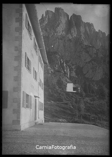 Una veduta dell'esterno del rifugio De Gasperi; sullo sfondo si riconosce la cappella di Maria Ausiliatrice costruita nelle immediate vicinanze