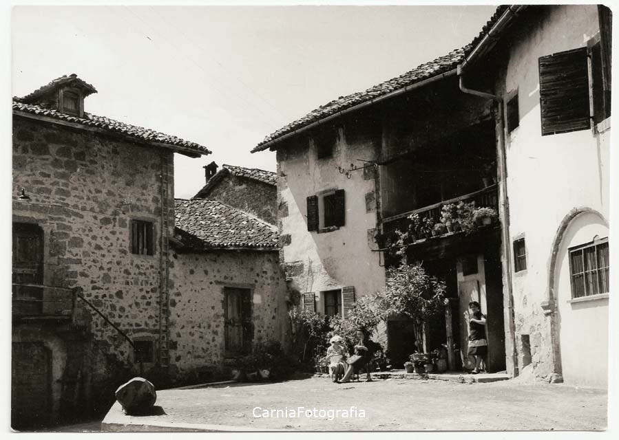 Veduta di un gruppo di case con all'esterno alcune persone intente a ricamare.