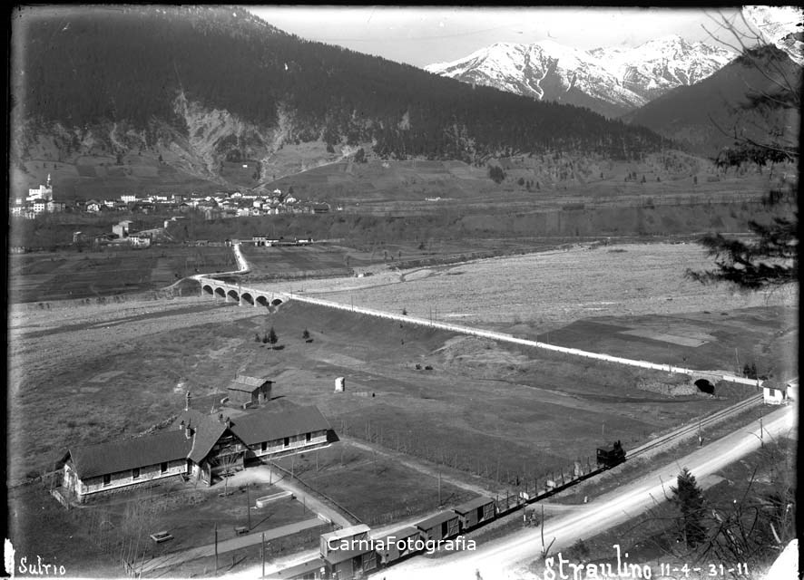 Veduta dell'abitato di Sutrio da posizione elevata: tra le case si riconosce la chiesa di sant'Ulderico sulle pendici del monte Arvenis. In primo piano la ferrovia che corre parallela a via Nazionale con un treno merci fermo sui binari. A seguire il ponte che, attraversando il torrente But, porta al paese