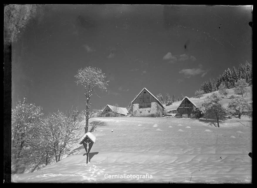 Scorcio invernale di Ravascletto con un crocifisso viario in primo piano e tre stavoli sullo sfondo.