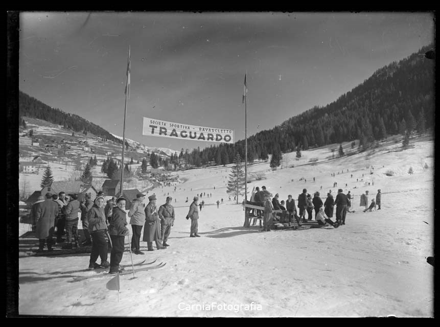 Sport invernali nei pressi della stazione di partenza della seggiovia Ravascletto - Monte Cuel Piciul. Diverse persone sono ritratte durante una gara di sci, presso il traguardo. Sul cartello, posto lungo la linea d’arrivo, si legge: “SOCIETÀ SPORTIVA – RAVASCLETTO/ TRAGUARDO”. La Società Sportiva di Ravascletto, nata ufficialmente il 30 marzo 1950, offriva in quegli anni importanti occasioni d’incontro e di divertimento per i ragazzi della Valcalda. Le fotografie di Antonio Comedò ci mostrano allenamenti, gare e premiazioni cui partecipavano con entusiasmo non solo gli atleti e le atlete ma la comunità intera.