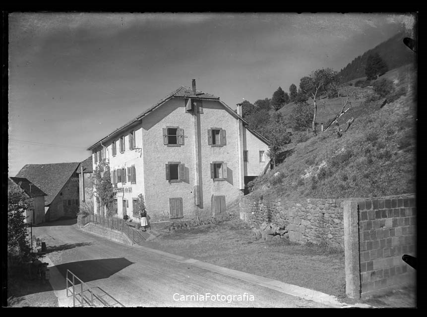 Scorcio del paese di Ravascletto. Antonio Comedò fotografa la Locanda alle Alpi. Due donne ed un bambino posano accanto all'ingresso della struttura.